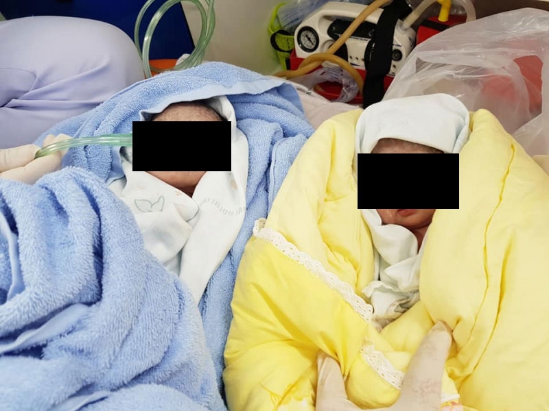 โดยใช้เวลาอยู่พอสมควรได้คลอดออกมาเป็นแฝดชาย คนเเรกเวลา 06.58 น. เเละคนที่สอง เวลา 07.03 น. สภาพร่างกายแข็งแรงสมบูรณ์ ปลอดภัยทั้งแม่และลูก ก่อนนำส่งไปยังโรงพยาบาลต่อไป